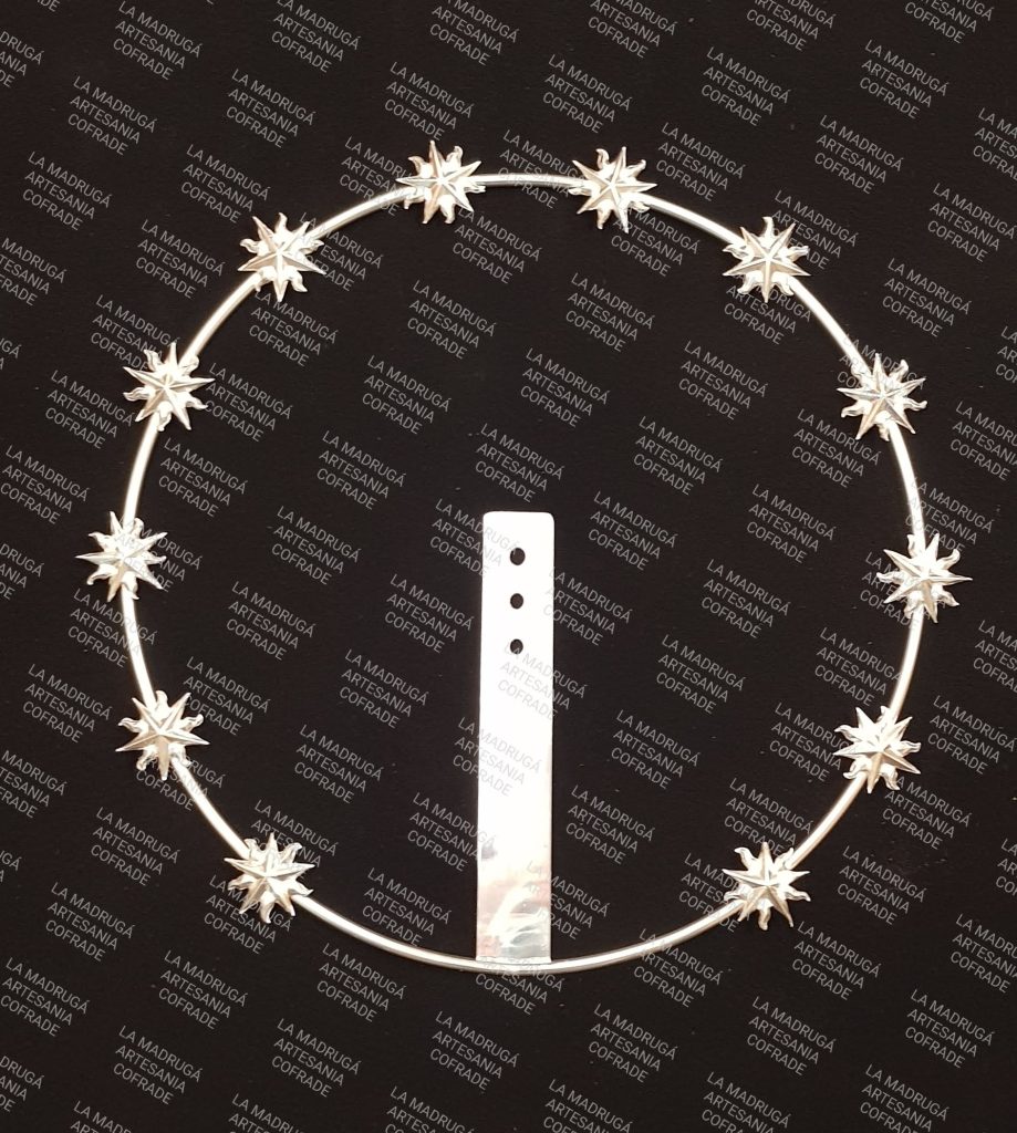 Este delicado aro de estrellas ha sido concebido en nuestros talleres de orfebrería como una creación artesanal que une tradición, técnica y simbolismo. Cada una de sus estrellas ha sido trabajada a mano con precisión, buscando transmitir un resplandor sereno y armónico que enriquezca la presencia de la imagen. Su diseño combina equilibrio y elegancia, dando forma a una pieza que destaca por su pureza y por la nobleza de los materiales empleados.