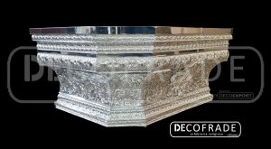 Presentamos una peana cuadrada para trono, una pieza que destaca por su impecable trabajo artesanal, fruto del saber hacer de maestros orfebres de Lucena, cuna
