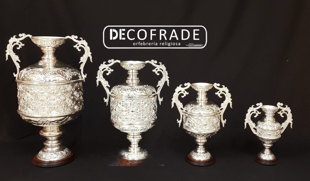 Las jarras, disponibles en diferentes tamaños, permiten crear armonías visuales adaptadas a cada necesidad, ofreciendo una versatilidad que las convierte en piezas imprescindibles tanto para espacios solemnes como para acompañar composiciones de carácter procesional. Su acabado en baño de plata otorga a cada superficie un brillo sereno y duradero, reflejando la luz con un resplandor limpio y uniforme que resalta la belleza de sus formas.