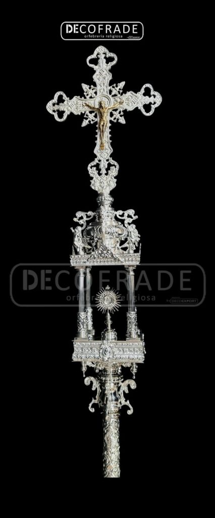 Cada aspecto de esta pieza, desde su diseño hasta su acabado, transmite la pasión y el cuidado con los que ha sido creada. Más que un objeto, se convierte en un emblema que realza la solemnidad y la devoción de cualquier ceremonia, reflejando la excelencia de la orfebrería artesanal de nuestros talleres. Esta cruz parroquial no solo destaca por su estética y presencia, sino también por la fuerza simbólica que porta, consolidándose como un referente de arte, tradición y maestría artesanal.