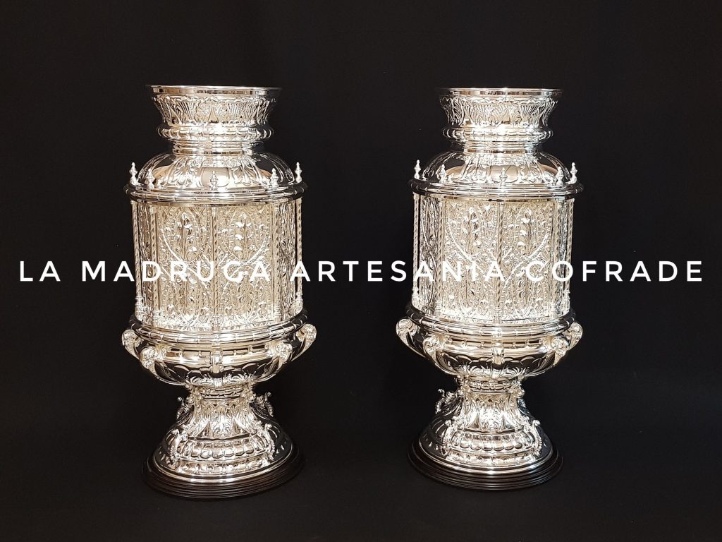 El conjunto está concebido no solo como un elemento decorativo, sino también como una expresión del saber hacer de nuestros talleres, donde cada creación es fruto de la dedicación y la pasión por la orfebrería tradicional. La forma octogonal, trabajada con precisión, representa el equilibrio entre la fuerza del metal y la delicadeza del diseño, logrando una pieza que combina majestuosidad y refinamiento.