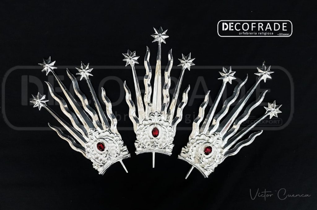Las potencias presentan un diseño flamígero de gran elegancia, con cada llama esculpida minuciosamente, transmitiendo un movimiento dinámico y lleno de fuerza que captura la luz y genera un efecto visual de gran solemnidad. Las puntas están adornadas con pequeñas estrellas, finamente trabajadas, que aportan un toque celestial y armonioso, integrando simbolismos de luz y guía que enriquecen la pieza más allá de su valor estético.